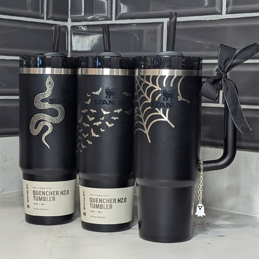 Halloween 30oz Black Stanley Quencher Engraved Tumblers | Spider Web, Bat, Snake Designs